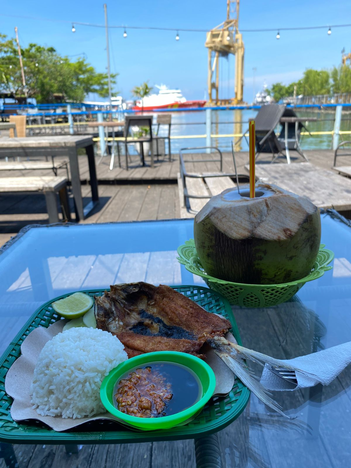 Salah satu spot paling populer adalah area depan Pelabuhan Soekarno Hatta — dari sini kamu bisa melihat kapal penumpang dan kapal barang berlalu-lalang sambil menikmati makan malam sederhana. Ada juga deretan penjual ikan bakar, cumi saus pedas, dan udang goreng tepung yang dimasak langsung di tempat. Rasanya khas Makassar banget, gurih, pedas, dan segar!
